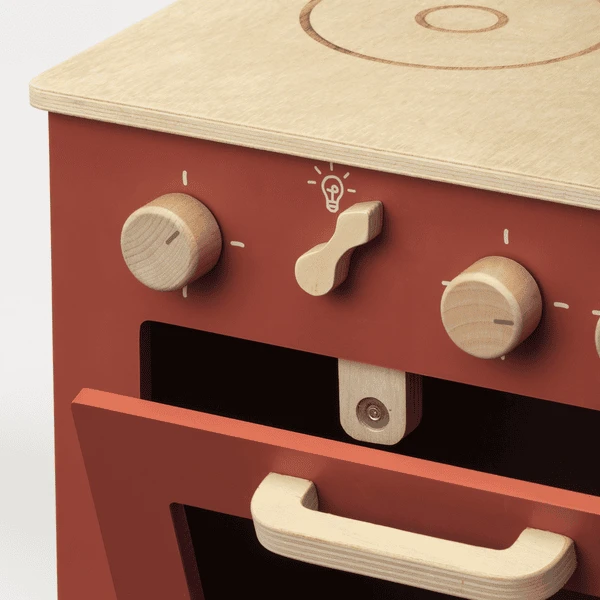 - Het speelgoedfornuis heeft drie platen, de ovendeur kan worden geopend dankzij een draaischarnier en de houten knoppen maken leuke klikgeluiden.