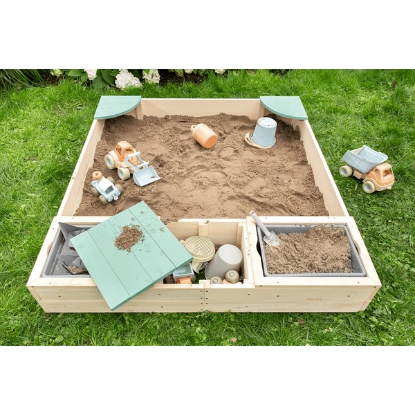 - Deze Sand box is niet alleen een visueel hoogstandje light , maar biedt nog meer: twee kleine afgeronde bankjes, een opbergvak met deksel in het midden, een Sand boxvlies en een afdekfolie.